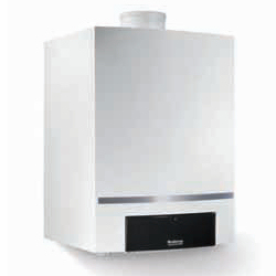 Chaudière mural, à condensation, avec échangeur de tubes en aluminium à ailettes avec technologie ALU-Plus et brûleur modulant à gaz naturelle, pour chauffage, puissance utile modulante de 10,4 à 45 kW, poids 48 kg, dimensions 695x520x465 mm, modèle Logamax Plus GB162-45 "BUDERUS", avec vanne à 3 voies pour la production d'E.C.S. par ballon échangeur. |